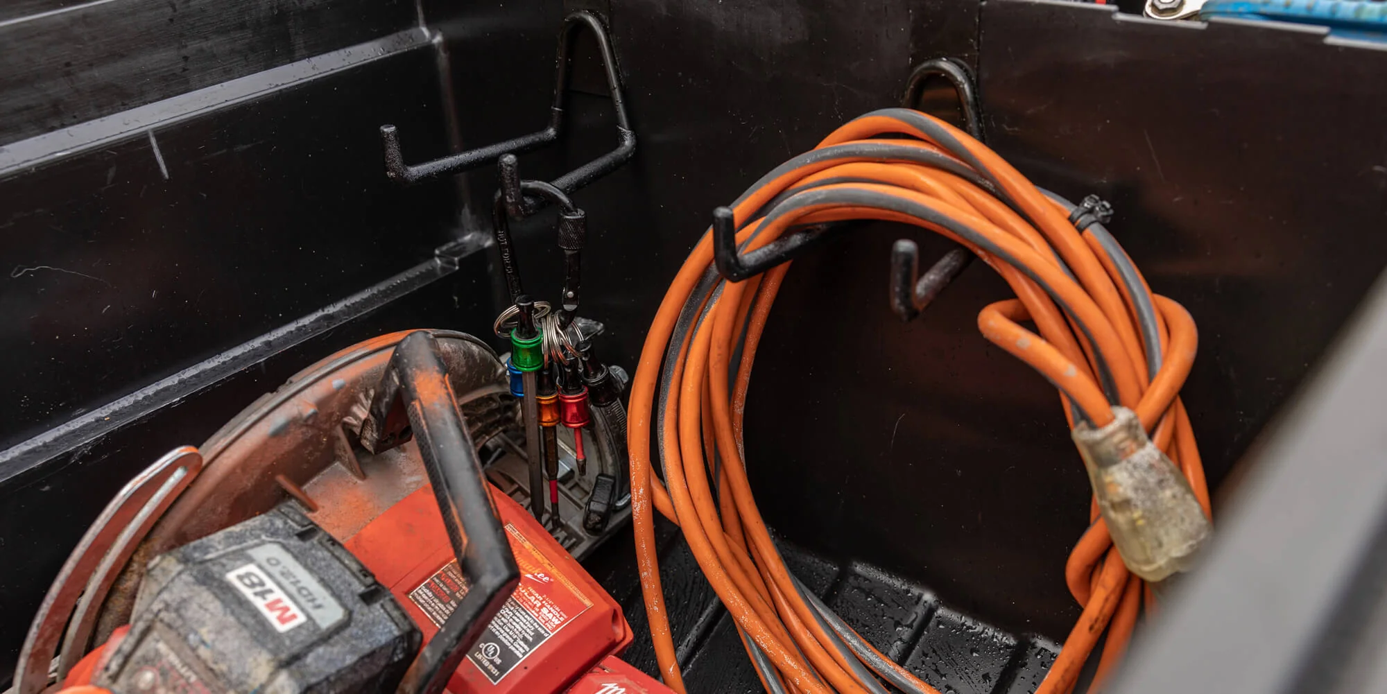 Customize your DECKED Tool Box with these heavy-duty hooks to keep items like hoses, extension cords, power tools, and hand tools tidy and within easy reach.